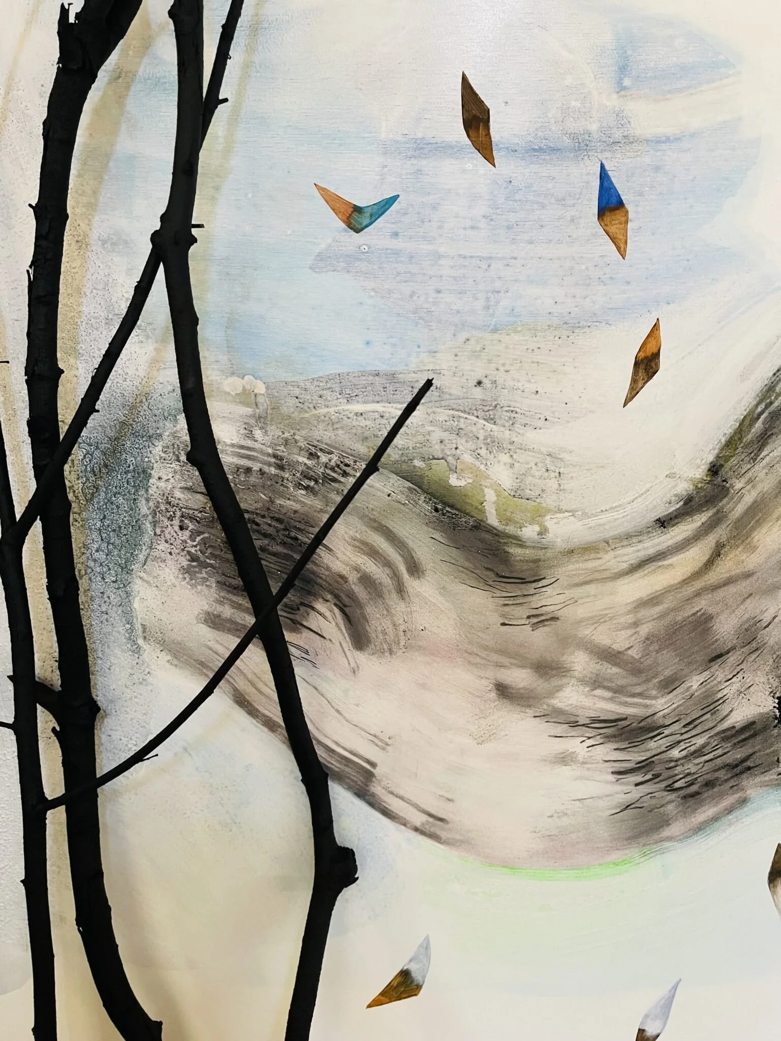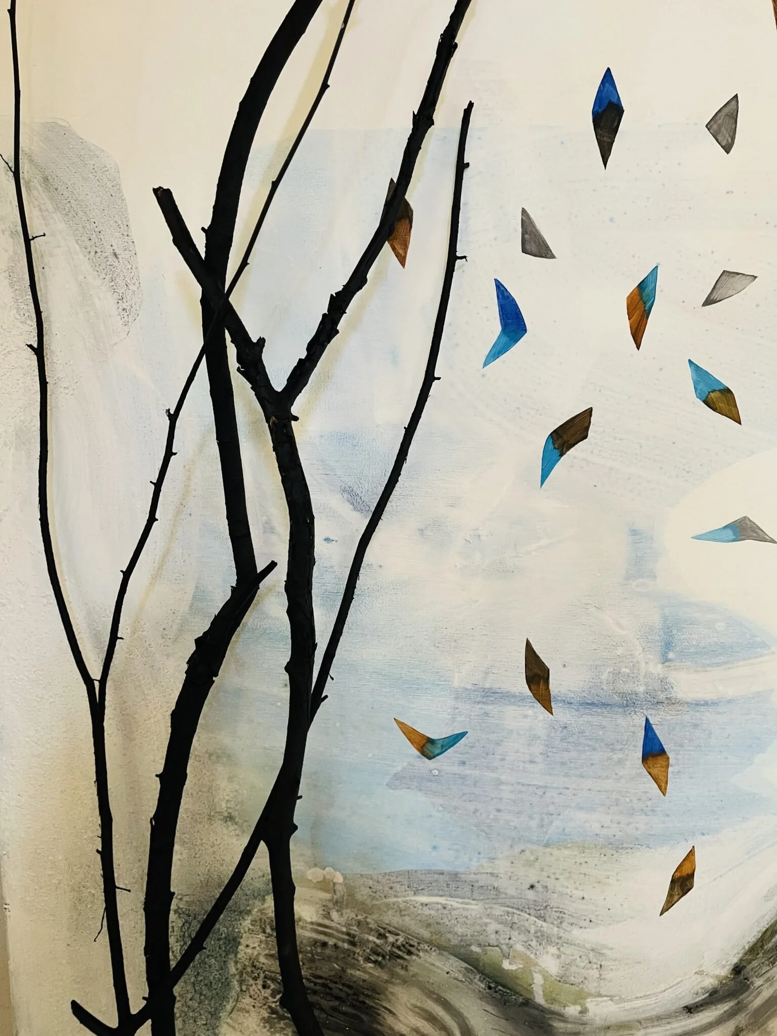 It matched perfectly to return to the first motive of that walk – the ice chips. I had stained them with blue and brown ink for my translation. Triangular shards. And now that imagery sat a top my white out canvas. Dancing along like the merry prank I felt the universe had played on me.