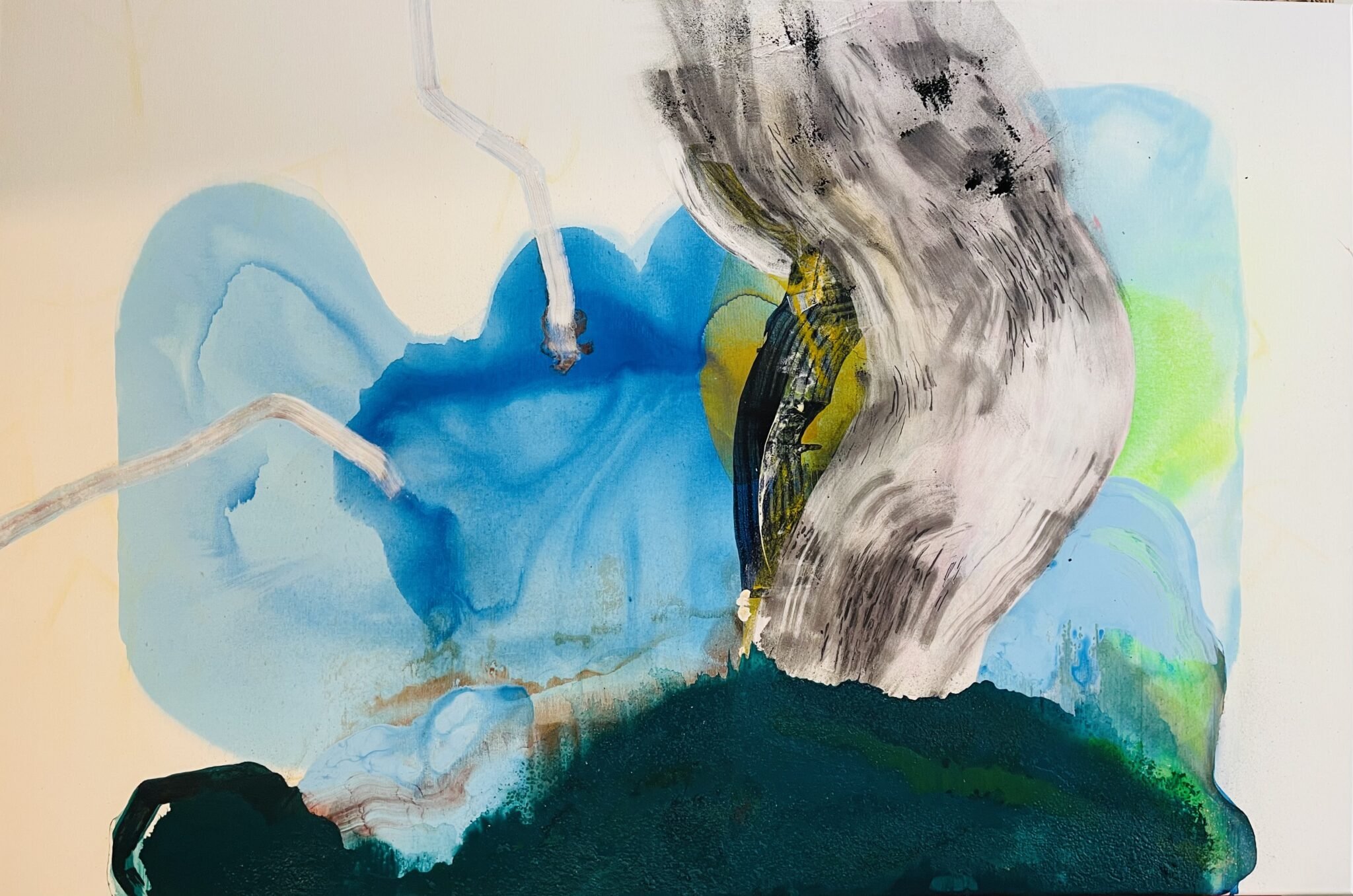 I now had an interesting experimental canvas, but it was time to access the narrative link. In Unit 1.1 I had enjoyed the work of Donna Huranca, and Ragna Bley. Both painters use paint or varying consistencies and add alternative materials for texture and connection to the environment. Researching their work, I began to formulate an idea that I wanted to bring in some mark making. I thought back to the initial exercise and how the translation of energy had inspired fast mark making. There was an area of the painting that had made a natural river course. I referred to one of my sketches in the ‘translation’ exercise and blocked in the course way with white paint and added tempo marks of the river.